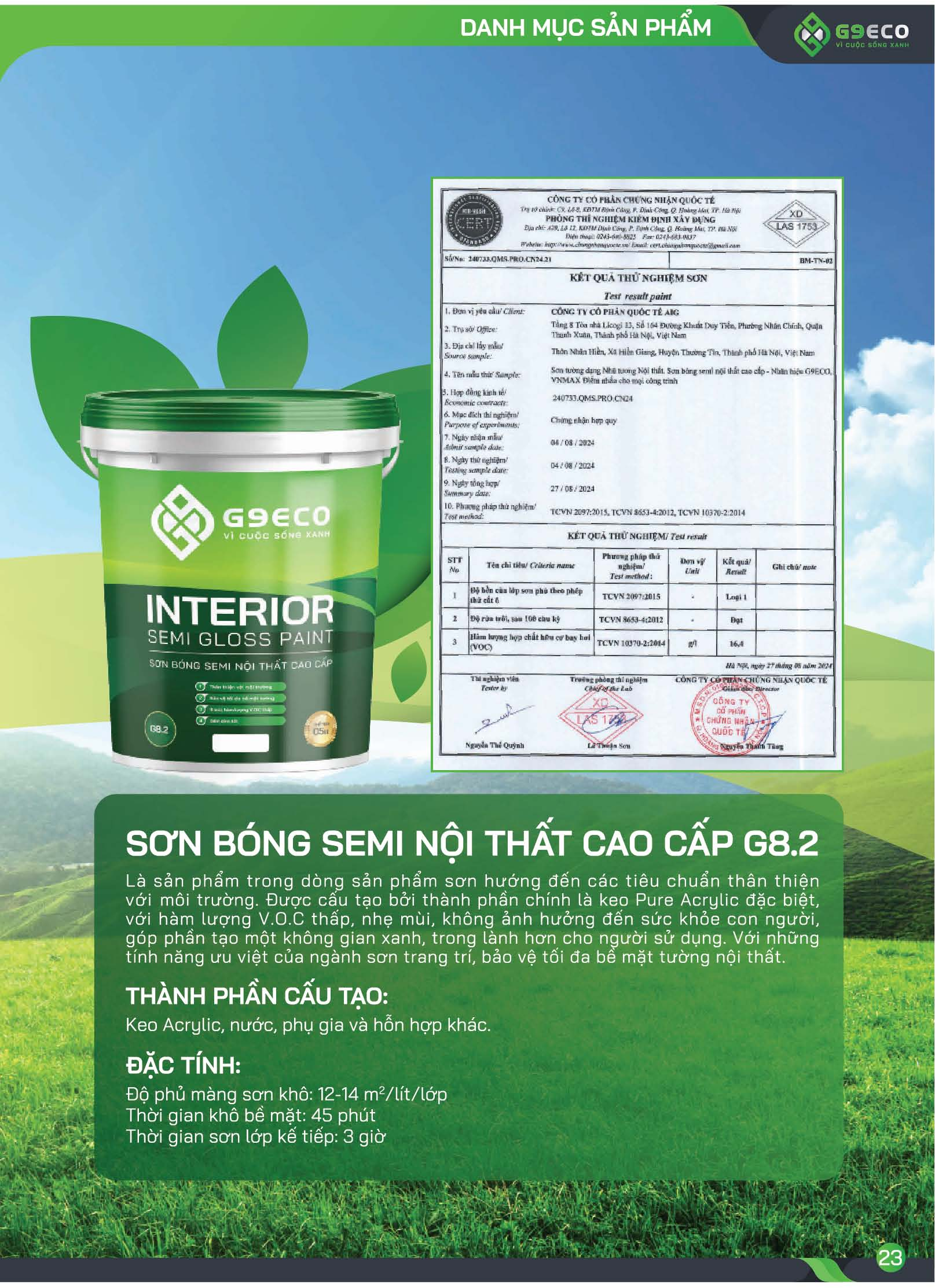 Là sản phẩm trong dòng sản phẩm sơn hướng đến các tiêu chuẩn thân thiện với môi trường. Được cấu tạo bởi thành phần chính là keo Pure Acrylic đặc biệt, với hàm lượng V.O.C thấp, nhẹ mùi, không ảnh hưởng đến sức khỏe con người, góp phần tạo một không gian xanh, trong lành hơn cho người sử dụng. Với những tính năng ưu việt của ngành sơn trang trí, bảo vệ tối đa bề mặt tường nội thất. Quy trình thi công Chuẩn bị bề mặt: Bề mặt cần sơn phải xử lý thật kỹ, làm sạch dầu mỡ, rêu mốc, bụi, loại bỏ các lớp sơn bị cũ. Chống thấm bằng các chất chống thấm chuyên dụng để tránh nước làm hư màng sơn. Đối với tường mới thì ta cần để ít nhất 21-28 ngày cho kết cấu của xi măng được ổn định thì mới tiến hành sơn. Độ ẩm của bề mặt phải đảm bảo tiêu chuẩn dưới 16% theo máy đo độ ẩm Protimeter. Pha sơn: Dùng nước sạch để pha loãng (5-10%) sau đó dùng cọ hoặc là con lăn để thi công. Thi công: Lăn 2-3 lớp, sơn lớp sau cách từ 2-4 giờ. Lưu ý: Tránh lửa, tránh xa tầm tay trẻ em. Đeo găng tay, khẩu trang khi thi công. Không đổ sơn ra môi trường, loại bỏ bao bì sơn đúng nơi quy định.