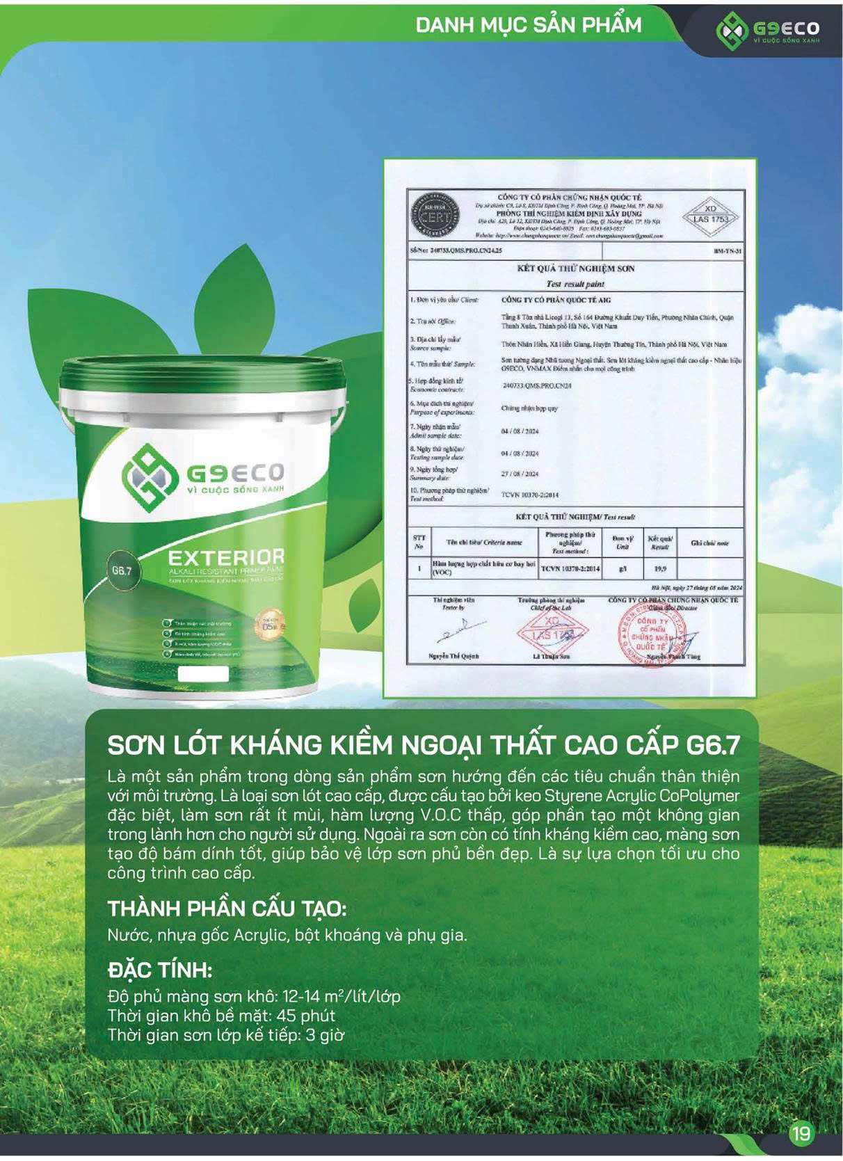 Sơn lót kháng kiềm ngoại thất cao cấp G6.7 Là một sản phẩm trong dòng sản phẩm sơn hướng đến các tiêu chuẩn thân thiện với môi trường. Là loại sơn lót cao cấp,được cấu tạo bởi keo Styrene Acrylic CoPolymer đặc biệt,làm sơn rất ít mùi, hàm lượng V.O.C thấp,góp phần tạo một không gian trong lành hơn cho người sử dụng. Ngoài ra sơn còn có tính kháng kiềm cao, màng sơn tạo độ bám dính tốt, giúp bảo vệ lớp sơn phủ bền đẹp. Là sự lựa chọn tối ưu cho công trình cao cấp.