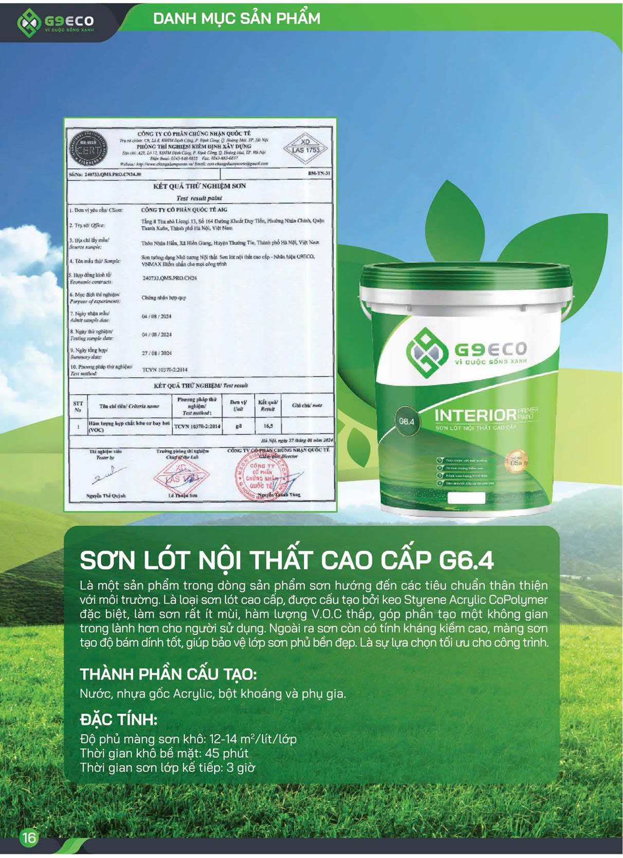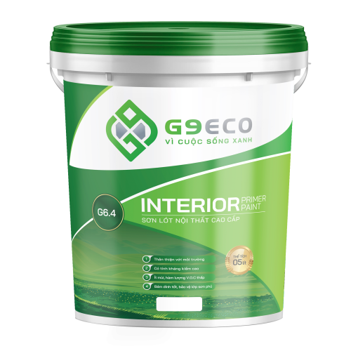 SƠN LÓT NỘI THẤT CAO CẤP G6.4 Là một sản phẩm trong dòng sản phẩm sơn hướng đến các tiêu chuẩn thân thiện với môi trường. Là loại sơn lót cao cấp, được cấu tạo bởi keo Styrene Acrylic CoPolymer đặc biệt, làm sơn rất ít mùi, hàm lượng V.O.C thấp, góp phần tạo một không gian trong lành hơn cho người sử dụng. Ngoài ra sơn còn có tính kháng kiềm cao, màng sơn tạo độ bám dính tốt, giúp bảo vệ lớp sơn phủ bền đẹp. Là sự lựa chọn tối ưu cho công trình. Quy trình thi công Chuẩn bị bề mặt: Bề mặt cần sơn phải xử lý thật kỹ, làm sạch dầu mỡ, rêu mốc, bụi, loại bỏ các lớp sơn bị cũ. Chống thấm bằng các chất chống thấm chuyên dụng để tránh nước làm hư màng sơn. Đối với tường mới thì ta cần để ít nhất 21-28 ngày cho kết cấu của xi măng được ổn định thì mới tiến hành sơn. Độ ẩm của bề mặt phải đảm bảo tiêu chuẩn dưới 16% theo máy đo độ ẩm Protimeter. Pha sơn: Khuấy đều trước khi sử dụng khoảng 2 phút. Có thể pha thêm nước sạch nhưng không quá 5%-10% Thi công: Lăn 1-2 lớp, sơn lớp sau cách lớp trước từ 2-4 giờ. Lưu ý: Tránh lửa, tránh xa tầm tay trẻ em. Đeo găng tay, khẩu trang khi thi công. Không đổ sơn ra môi trường, loại bỏ bao bì sơn đúng nơi quy định.